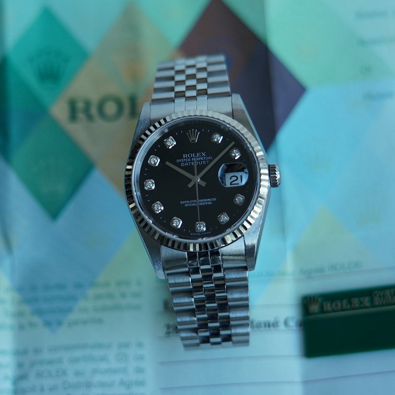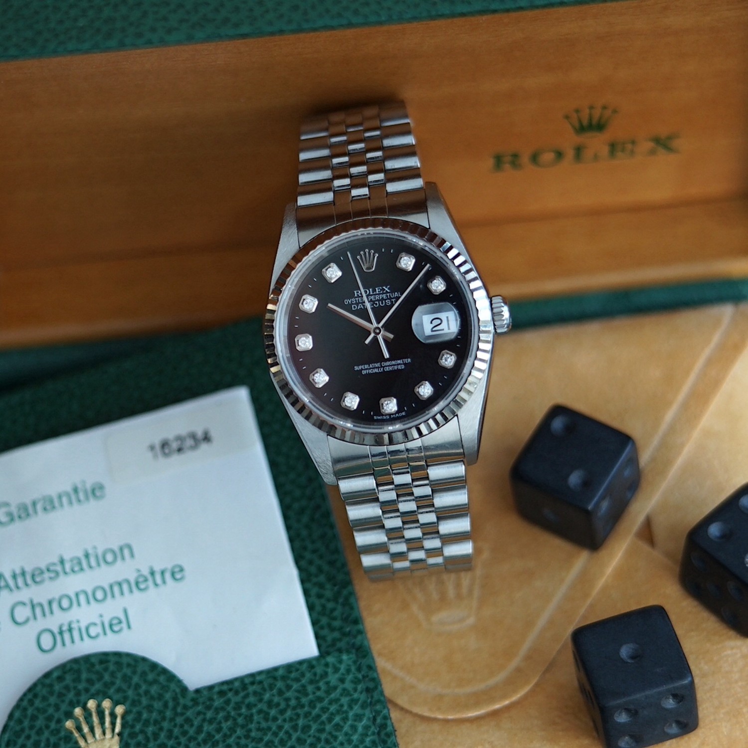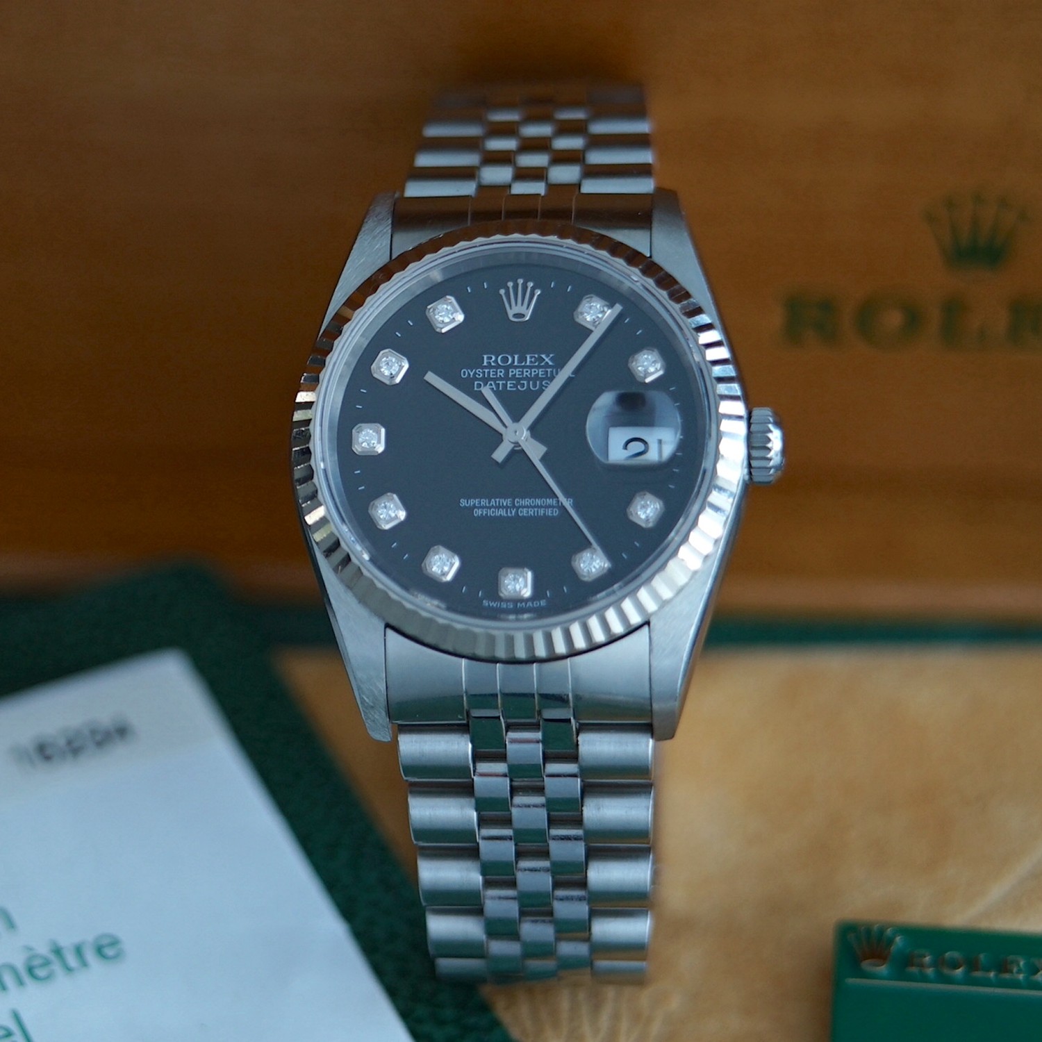 Rolex Datejust 16234 cadran noir, index diamant, boite & papiers