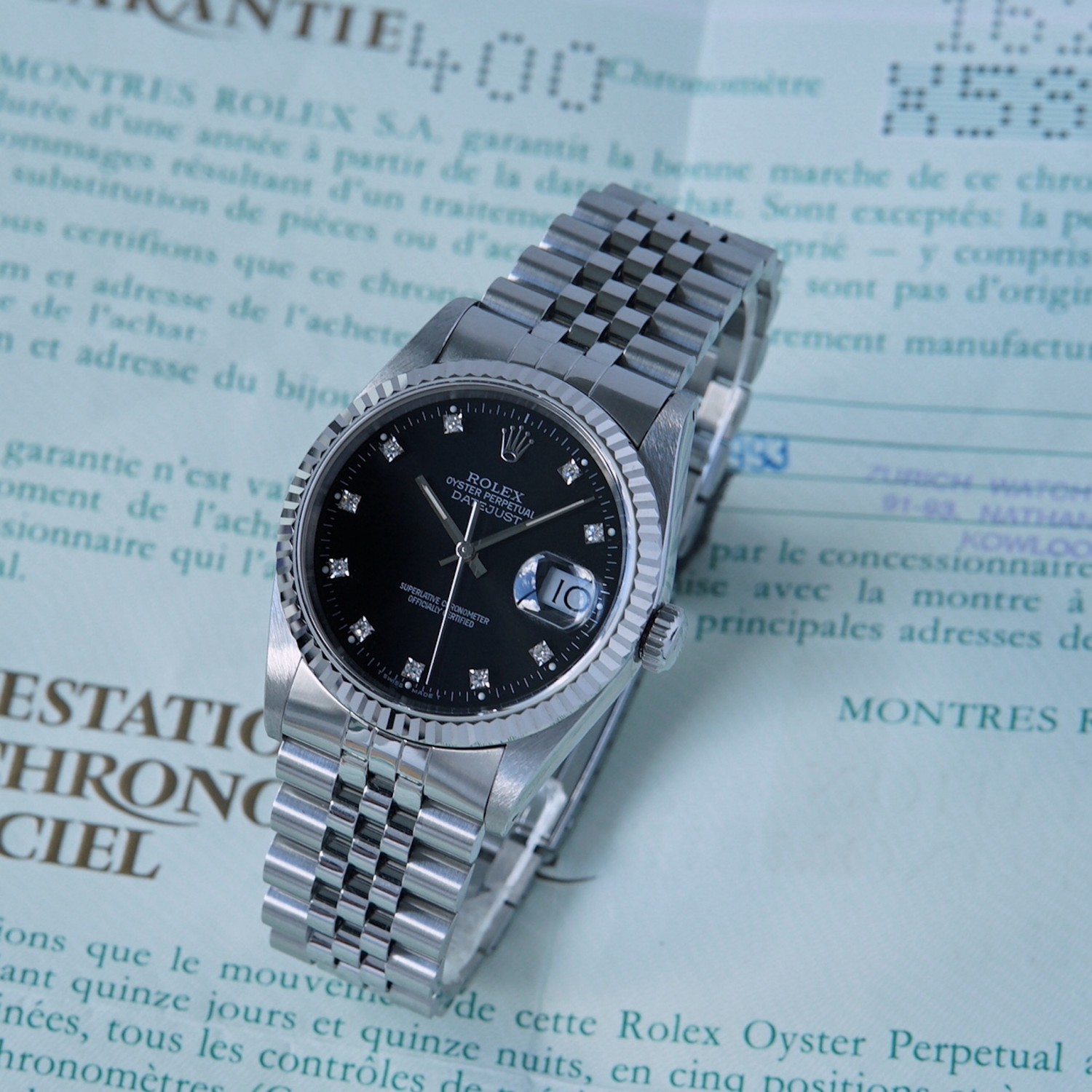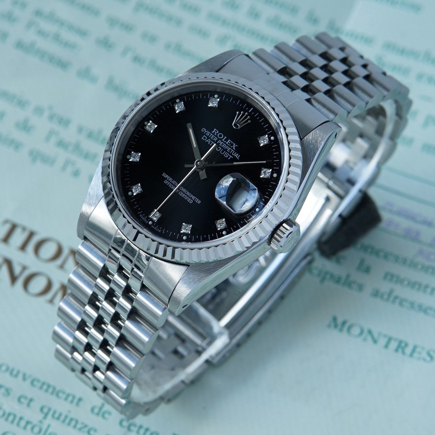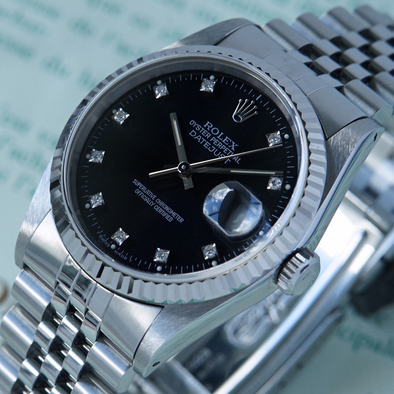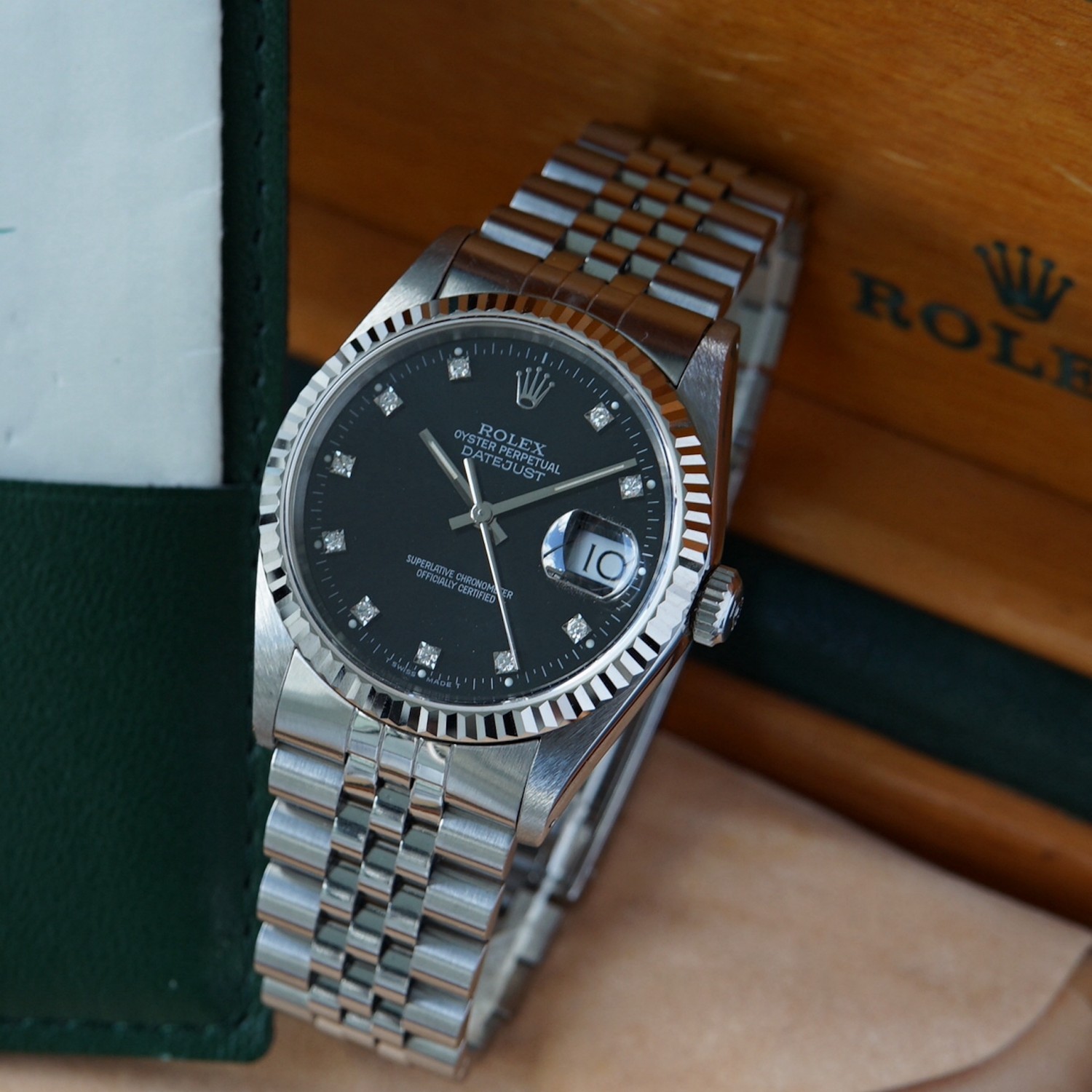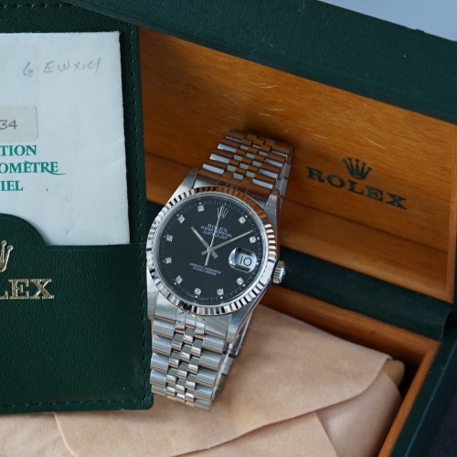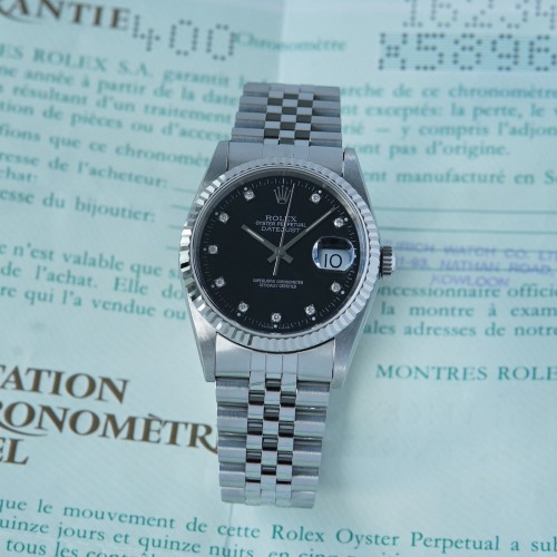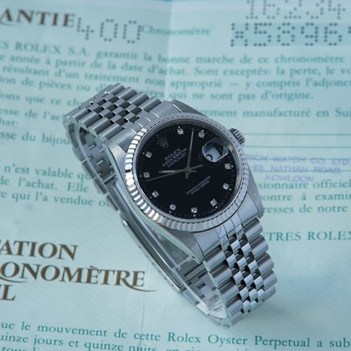 Rolex Datejust 16234 black dial, diamond index with box & papers