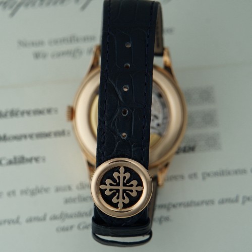 Blue PP bracelet with rose golden folding clasp with Calatrava buckle.
