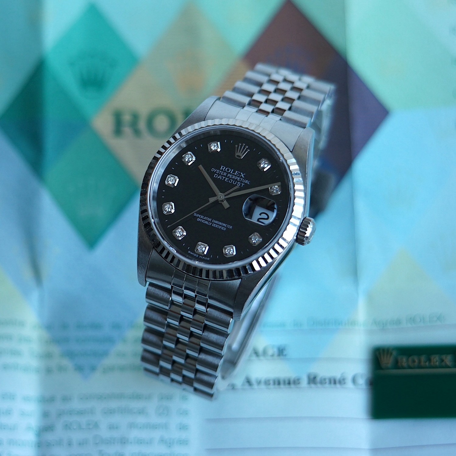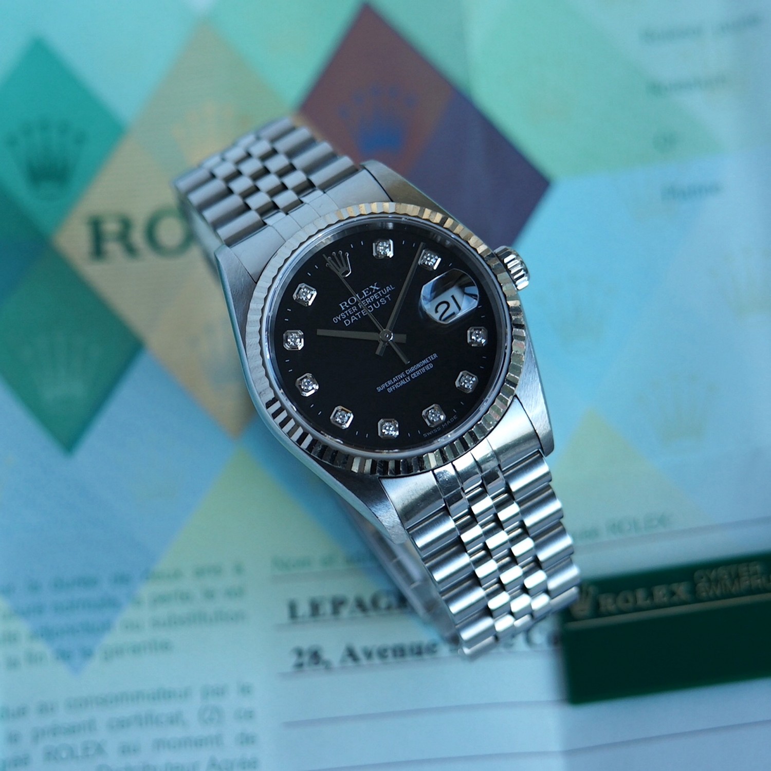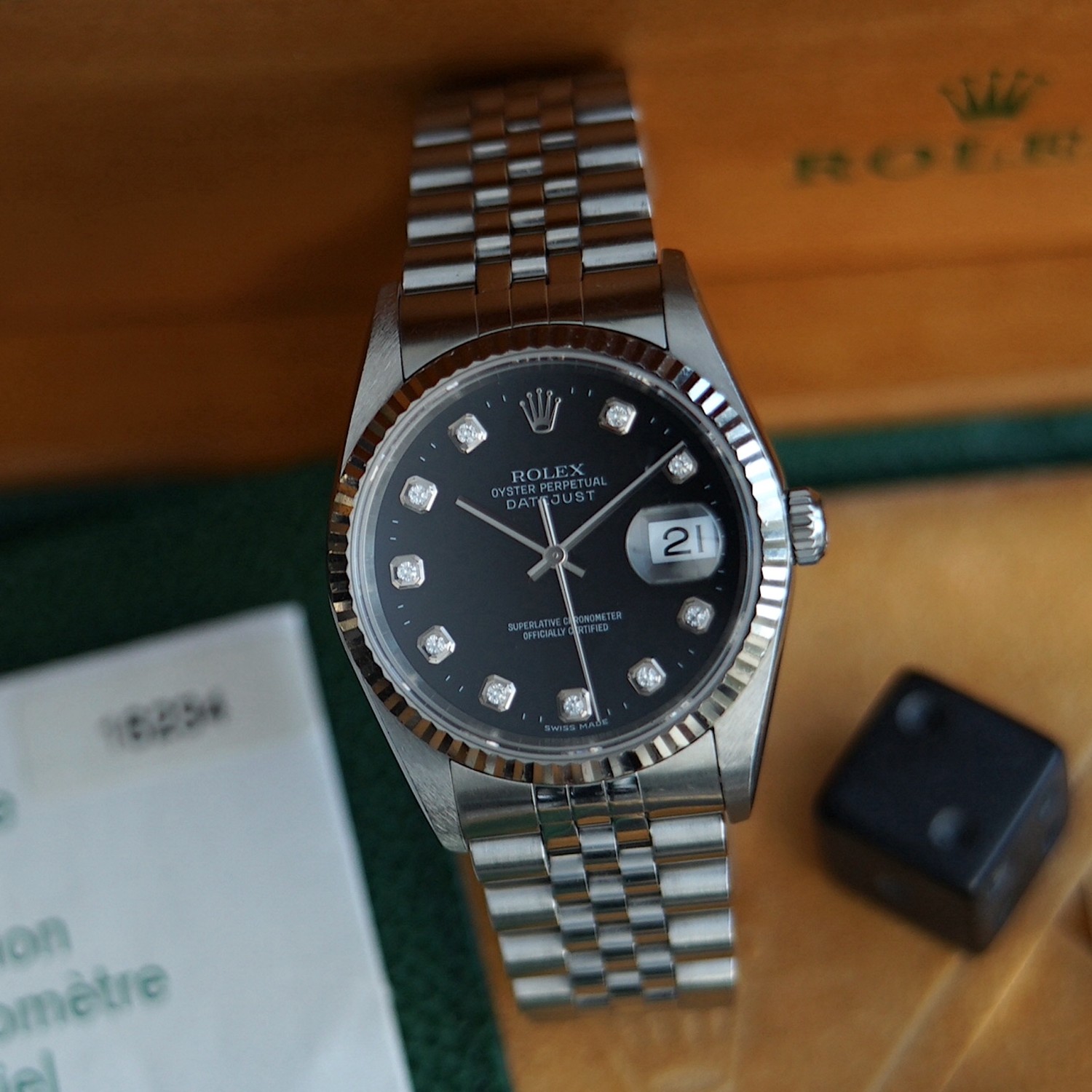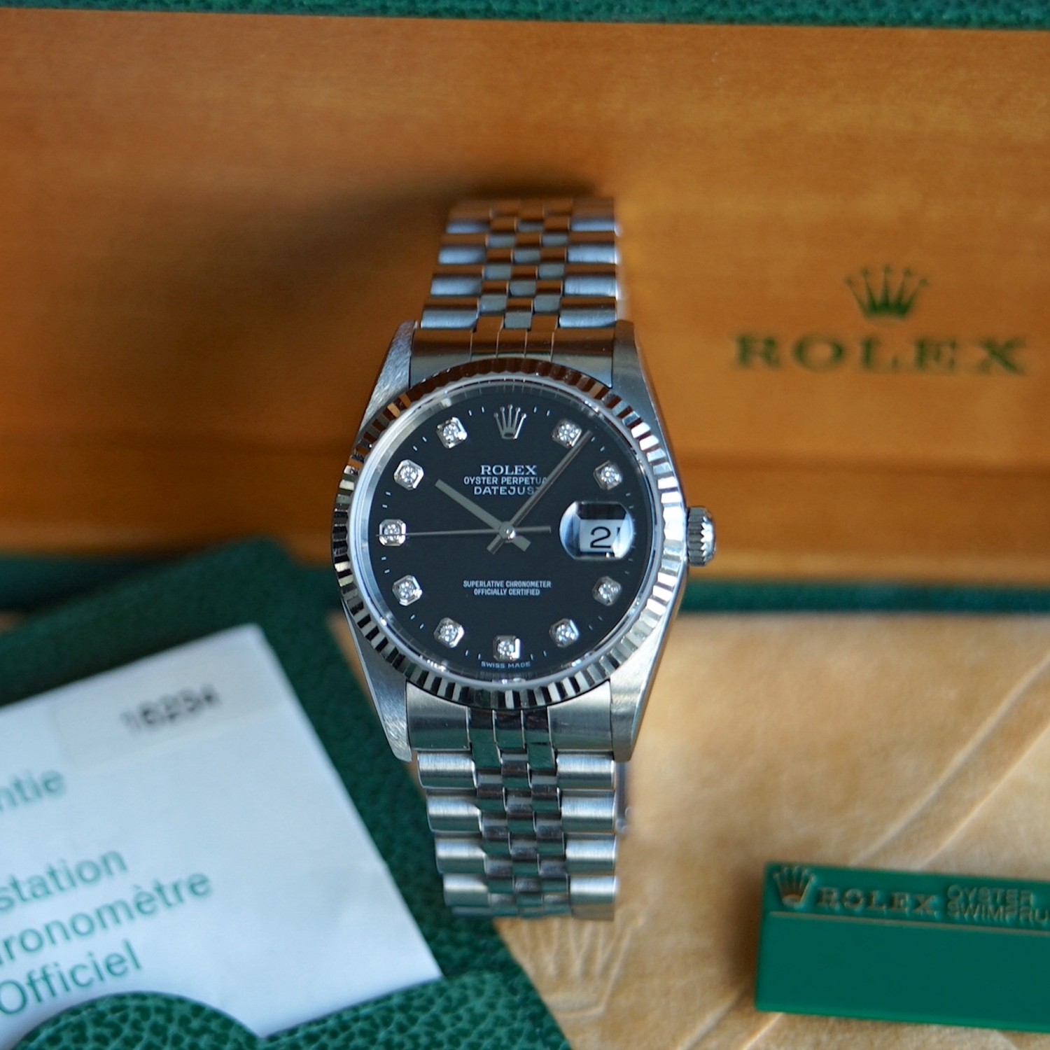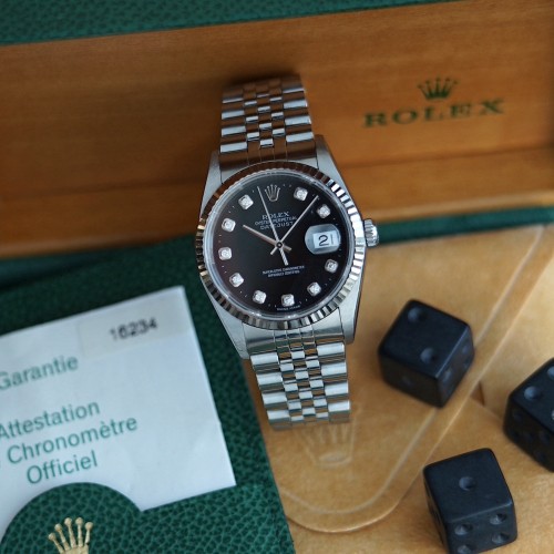 Rolex Datejust 16234 black dial, diamond index with box & papers